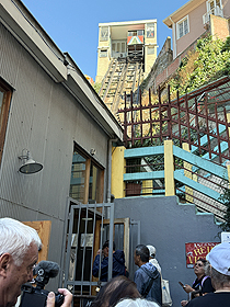 Start in Valparaiso, Hafenstadt von Santiago de Chile, mit Auffahrt zur Oberstadt. Dort schönen Blick über die Bucht nach Villa del Mar.